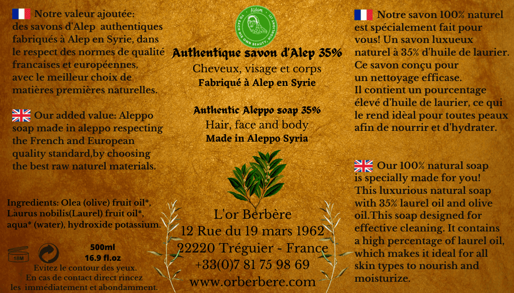 Ce savon d’Alep liquide 500 ml à l’huile d’olive végétal et 35% d'huile d'huile de Laurier respecte les peaux sèches, sensibles et à problèmes.